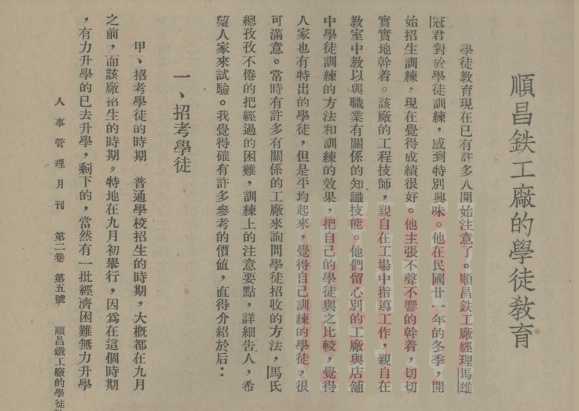 《人事管理》1937 年第2卷第5期第41-46页刊载的《顺昌铁工厂的学徒教育》