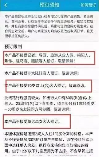 ▲ 2017年,某网上部分云南游产品,对游客的职业及地域进行了限制。图片来源/网络