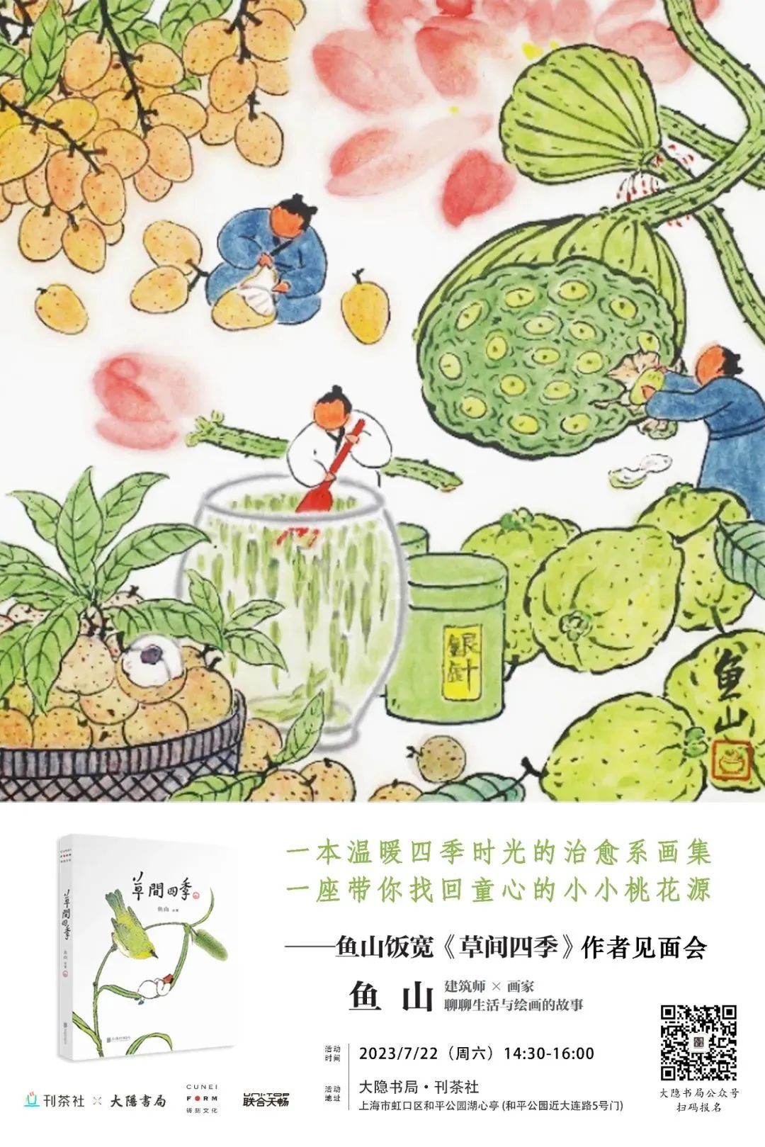 7月22日, 大隐书局·刊茶社邀大家在“鱼山饭宽《草间四季》作者见面会”上,与鱼山老师一同在四季轮转间思考生活感悟,在这炎热的夏季,于一方草间体味人生清凉。