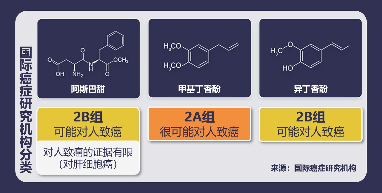 国际癌症研究机构根据人类癌症(特别是肝细胞癌这种肝癌)方面的有限证据,将阿斯巴甜归类为可能对人类致癌(第2B组)。在实验动物中发现的致癌证据也有限,与导致癌症的可能机理有关的证据同样有限。