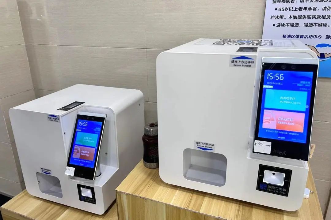 虽然暑期人流量骤增,但游泳馆的出入口秩序井然,得益于使用了智能化管理系统。游泳馆内摆放着的四台智能游泳手环领取归还设备,首次应用于夏日游泳旺季。无需押金、无需人工,泳客们通过扫码或者刷卡便可自助领取和归还游泳手环,不少每日来此游泳的孩子们已经熟练操作。