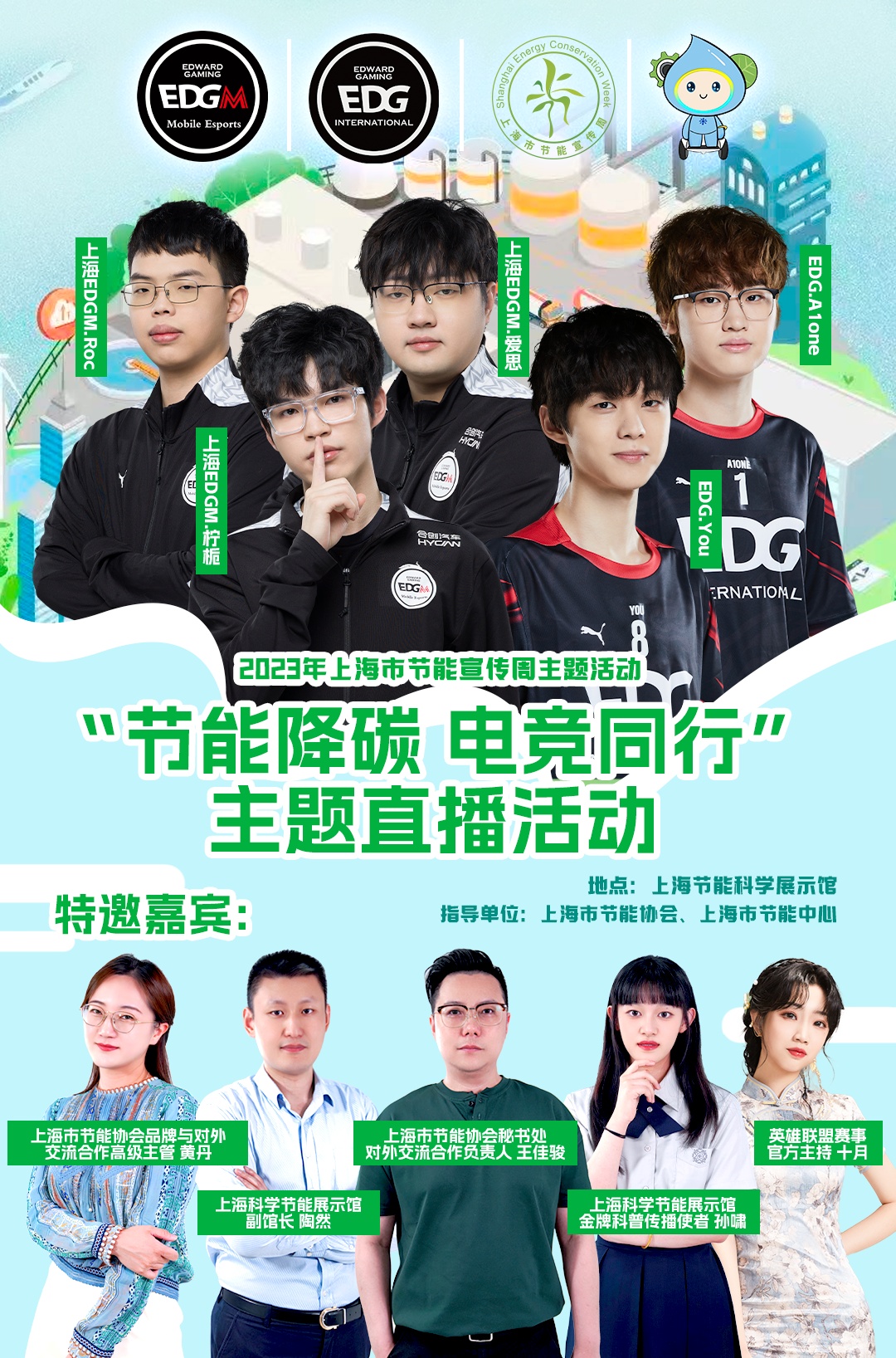 来自上海EDG.M王者荣耀分部和EDG英雄联盟手游分部的5名电竞选手化身主播,与上海市节能协会、上海市节能中心的专业人士相聚上海科学节能展示馆,对绿色饮食、绿色家居、绿色出行、循环再生等领域相关知识技能展开科普宣传,对各类绿色消费品进行推介。