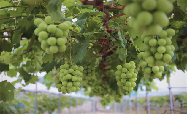 在嘉定工业区徐华果蔬专业合作社内,一串串葡萄挂在藤蔓上,颗颗饱满、晶莹剔透,在阳光的照射下,有的乌黑亮丽,有的翠如碧玉,空气中都带着诱人的香气。