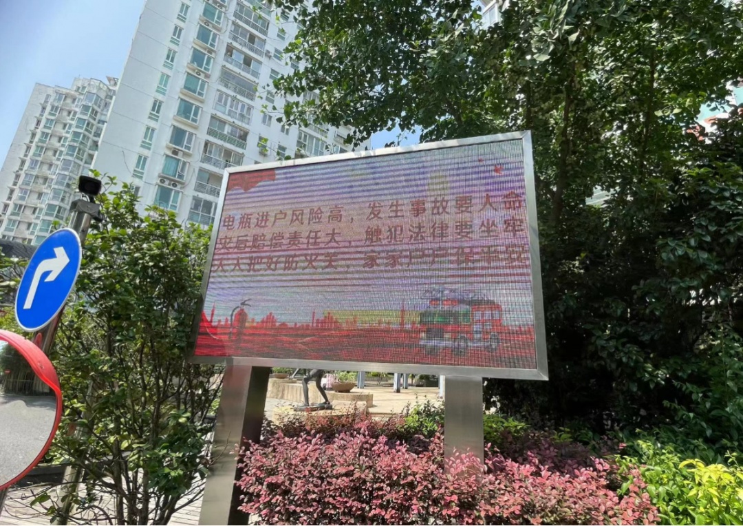 为了增加宣传效果,各居民区采取了多样化的宣传手段。电子屏警示标语和社区门口电喇叭滚动播放宣传标语成为了宣传的亮点,生动而引人注目。这些警示标语和宣传语言,提醒居民遵守安全规范,不在楼内充电、不进行“飞线”充电,确保电动车充电安全。