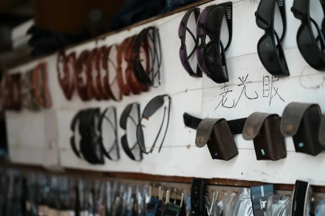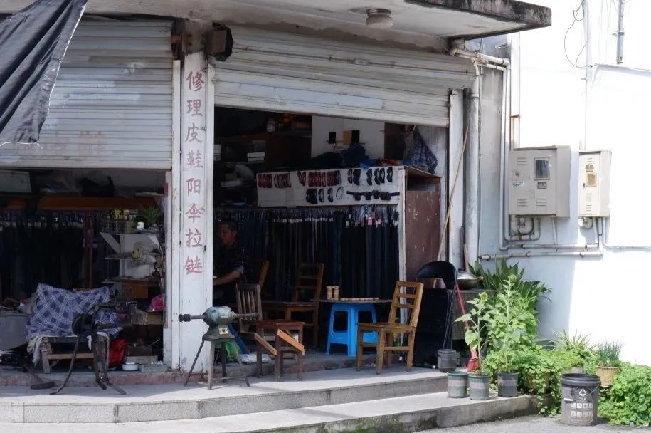 门口的墙壁上写着“修理皮鞋阳伞拉链”,店内整齐地陈列着各式各样的男士皮带。