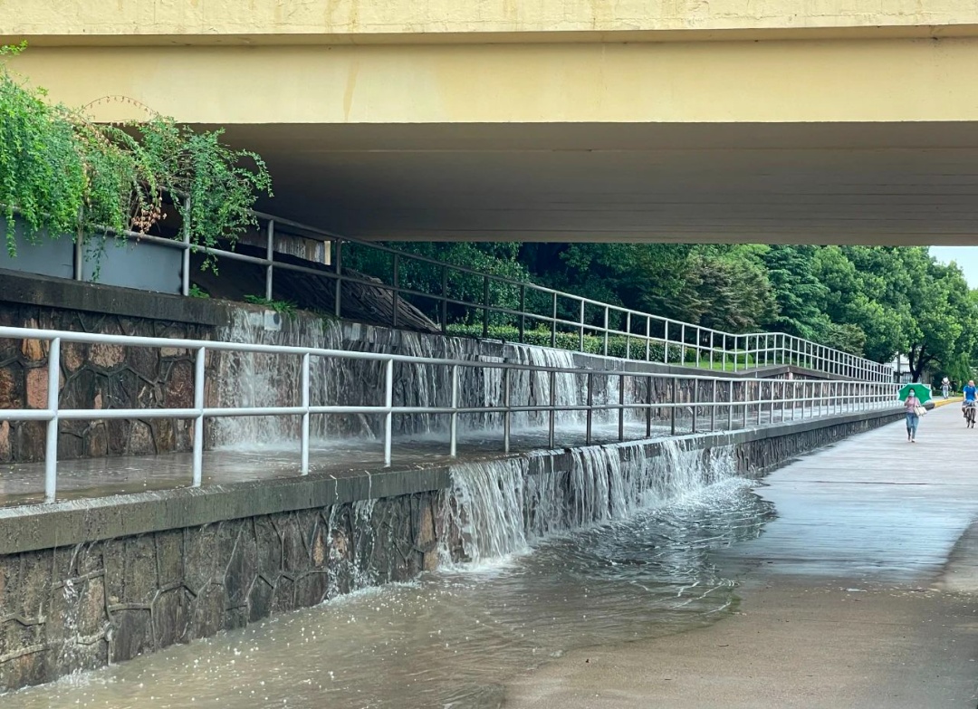 上午9点,记者看到,卫零路下立交桥出现大量积水,桥面两侧的积水正沿着台阶向地势低洼处流去。中心段的机动车车道已全部封控,人行道以及非机动车道还有不少行人出行。