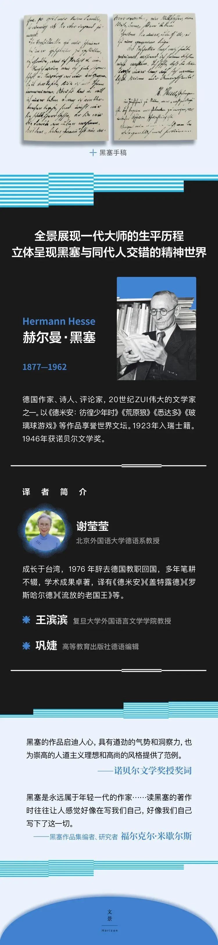 这些书信见证了黑塞从少年到老年的生平与经历,记录了他如何在创作道路上不断突破自我,成为一代大师,同时立体呈现了黑塞与同代人交错的精神世界,展示出半个多世纪历史交替与文化变迁的轨迹。