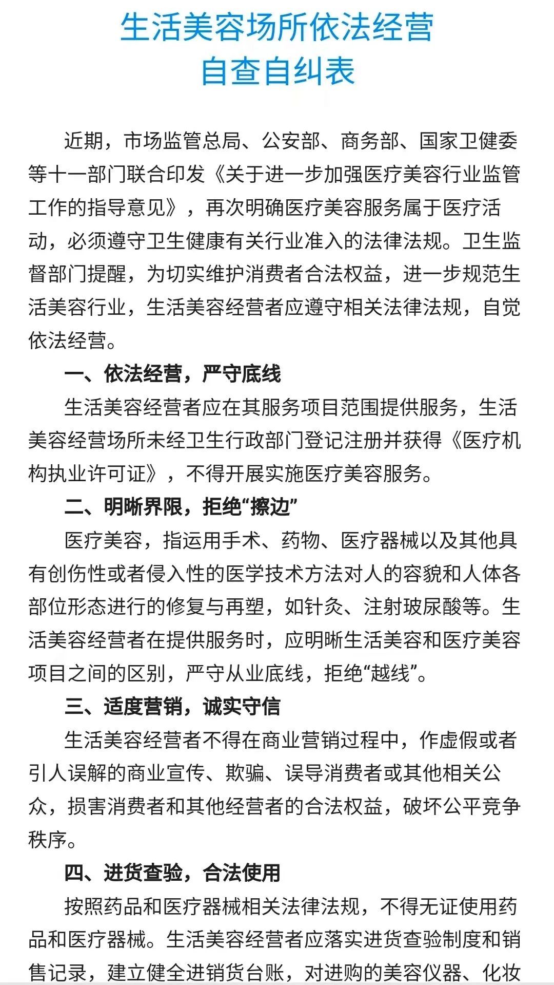 《自查表》分别从“依法经营,严守底线”“明晰界限,拒绝‘擦边’”“适度营销,诚实守信”“进货查验,合法使用”四方面提示生活美容经营者,严守从业底线,拒绝越线开展医疗美容服务。
