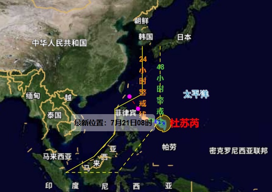 今年第5号台风“杜苏芮”(热带风暴级;英文名称:Doksuri;名字来源:韩国;名称意义:一种猛禽,鹰)21日上午在菲律宾以东洋面生成,上午8点钟其中心位于菲律宾马尼拉偏东方向约1280公里的洋面上,就是北纬13.9度、东经132.8度,中心附近最大风力有8级(18米/秒),中心最低气压为998百帕,七级风圈半径240-280公里。