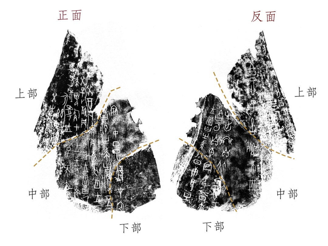 甲骨出土后往往碎裂四散,甲骨文刻划纤细,肉眼往往难以辨识,墨拓可使字口黑白分明、纤毫毕现。利用甲骨拓片,学者可对其进行拼缀复原。这件涂朱刻辞牛胛骨,可与故宫博物院、清华大学收藏的甲骨拼合,复原出一次商王车祸记录、一次商代彩虹记录等罕见史料,对于研究历史弥足珍贵。
