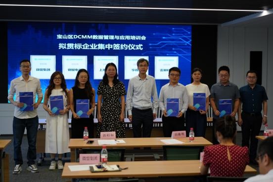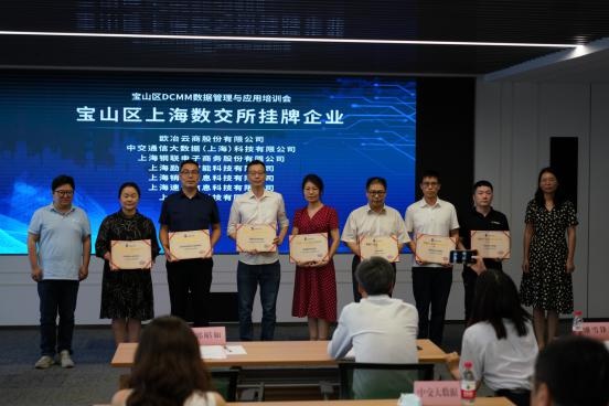 会议现场还举行了宝山区DCMM拟贯标企业集中启动仪式和数交所挂牌企业授牌仪式。上海智慧城市发展研究院与上海微盟企业发展有限公司、上海钢银电子商务股份有限公司、上海钢联电子商务股份有限公司、亨得昂信息科技(上海)有限公司和上海雷昶科技有限公司同台举行了企业DCMM意向贯标集中签约仪式。区信息委、上海数据交易所共同为欧冶云商、中交大数据、上海钢联、励骋智能、销氪科技、速灵科技、竞动科技7家企业颁发了数据产品挂牌证书。
