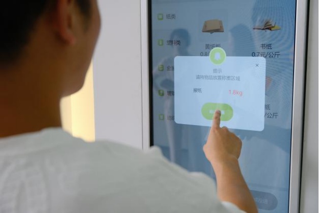 自助交投区,第三方企业依托多年社区源头回收的经验研发出自助交投产品,包括微信小程序、现场操作设备、称重设备、细分类交投区。居民扫码后即自动登陆居民账号,将细分类的可回收物分类称重并根据提示投放至对应投口,收益即时到账,同时还可获得碳值,可查看自己的减碳贡献。