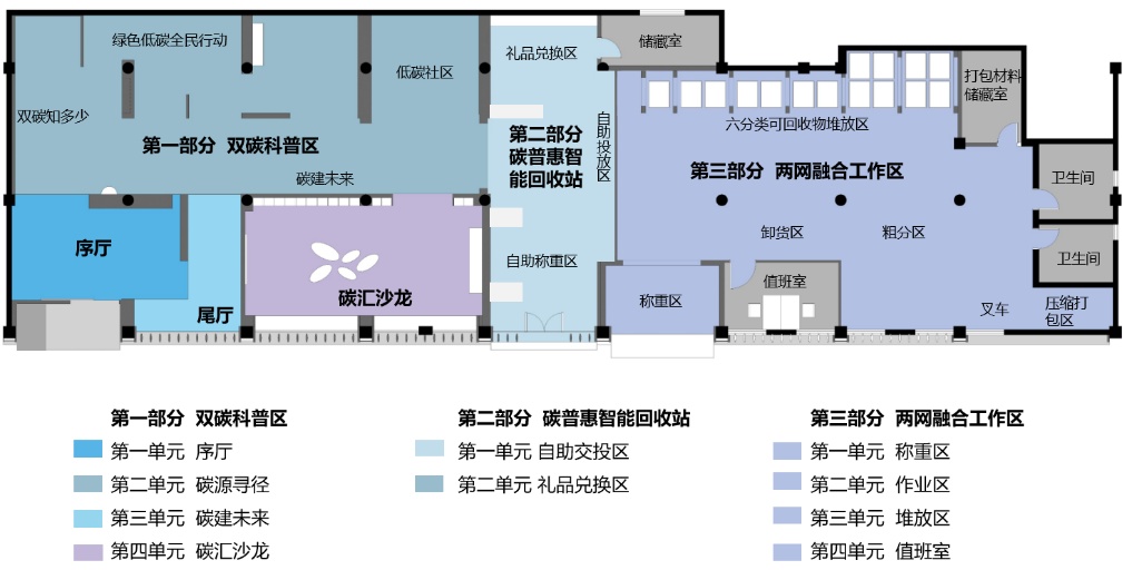 中转站计划向市民群众开放,让市民们对“双碳”有一个直观的新体验,感受到垃圾分类的好处。新的中转站根据功能共分为三部分:双碳科普区、碳普惠智能回收站及可回收物工作区。