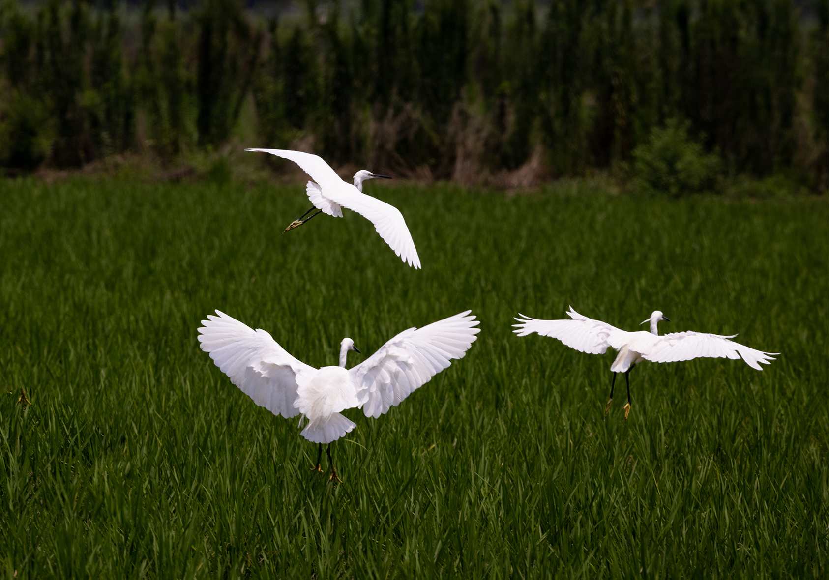 盛夏时节,一群群白鹭来到了济南荷花路街道王家闸村稻田里,飞舞、觅食、休憩、嬉戏,构成了一道人与自然和谐相处的美丽田园风景线。白鹭被称为“大气和水质状况的监测鸟”,对生活环境要求较高,王家闸村空气清新,天蓝水清,引得白鹭在此栖息。