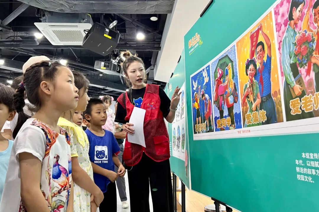 7月18日下午,在岳阳街道新时代文明实践分中心展厅,来自人乐居民区的小朋友们跟着志愿讲解员的脚步开启了一场关于海派文明风尚的“漫”话之旅。清新淡雅的国风漫画浪漫再现了有关学习与友谊的名言典故,风格浓郁的八十年代宣传画描摹出校园里健康成长的活力风采,简洁明快的白描漫画勾勒出了“上海腔调”的有趣细节……在讲解员绘声绘色的讲述中,孩子们一边细细浏览连环漫画里的精彩细节,一边品味蕴含在构图和笔触间的上海风采。