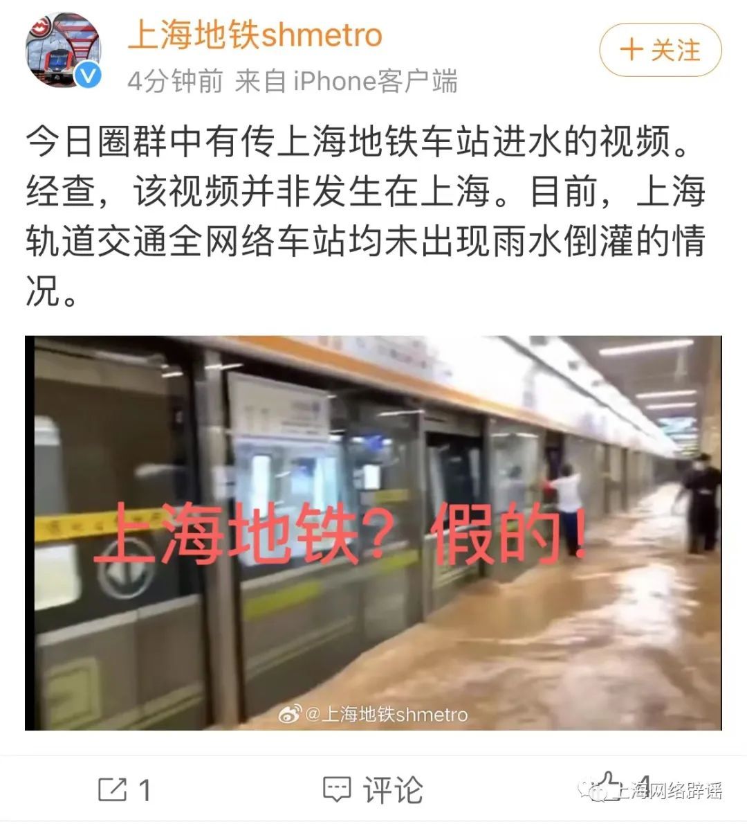 期间,上海辟谣平台发现,网传一段地铁车厢大水漫灌的画面被指发生在上海。对此,上海地铁回应表示,目前,上海轨道交通全网络车站均未出现雨水倒灌的情况。今日圈群中有传上海地铁车站进水的视频。经查,该视频并非发生在上海。