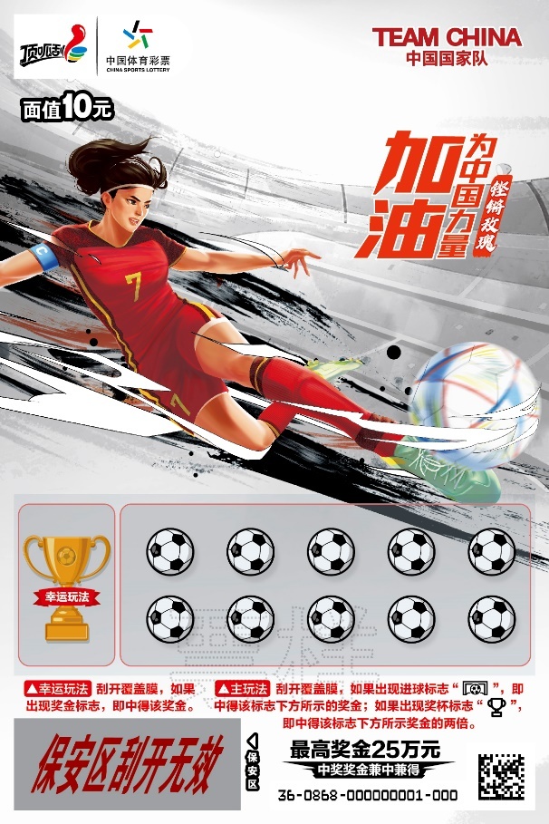 2023年国际足联女子世界杯于7月20日至8月20日在澳大利亚和新西兰举办。恰逢世界级大赛,体彩即开票“铿锵玫瑰”也载幸而来。该票共2款票面,画面色调以红、银为主,主形象为女足运动员,画面充满力量感和运动激情,展示了赛场上女足铿锵有力、拼搏向上的精神,致敬中国女性力量。