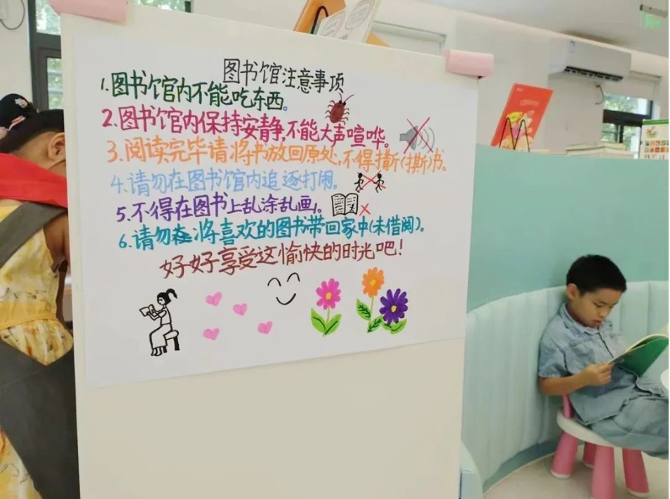 值得一提的是,为保障图书馆的秩序,孩子们自发展开了有关“图书馆公约”的讨论,约法三章,分段划分阅读时间与玩乐时间,约定各时间段的秩序。每个小朋友都化身小小图书管理员,面对违反公约的情况,主动出击,捍卫“图书馆公约”的公信力。