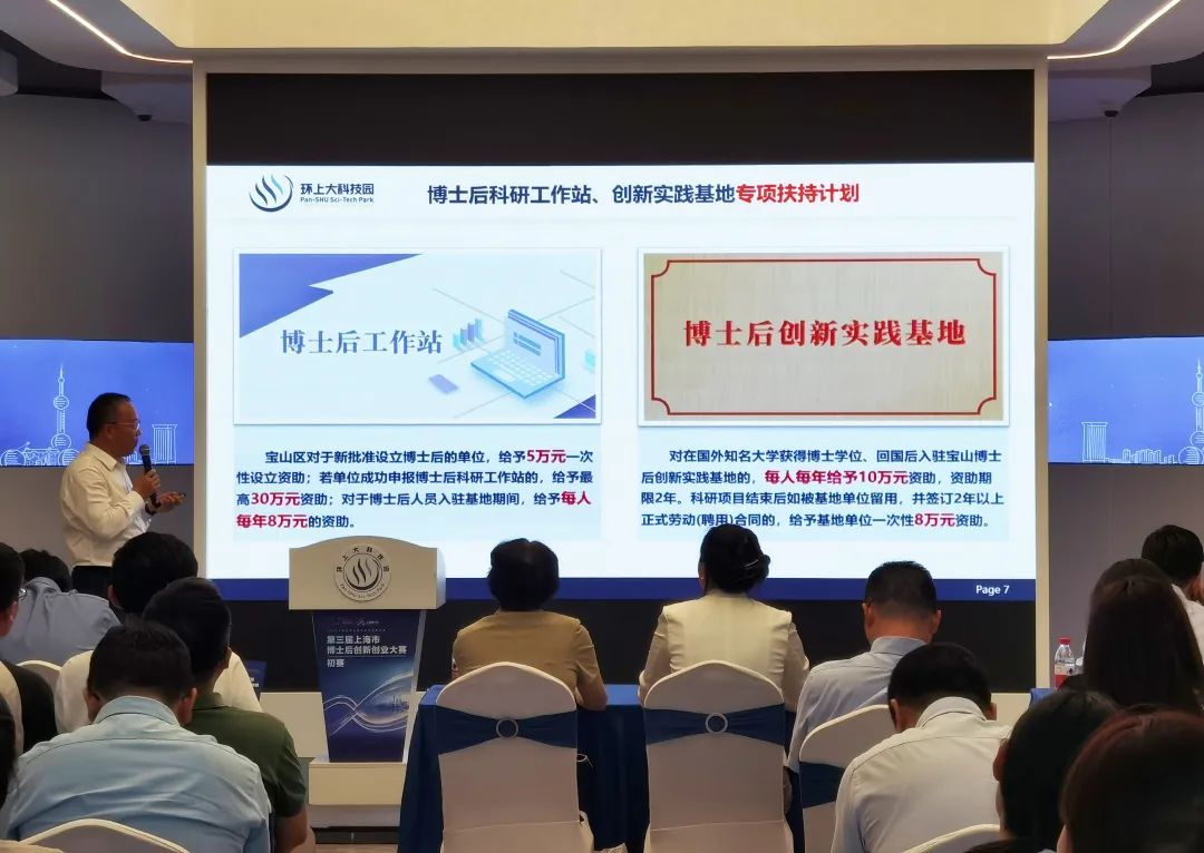 本次大赛,宝山区人社局在与上海大学联动合作的基础上,积极会同环上大科技园形成三方工作合力,依托科创30条、人才新政25条、环上大黄金10条等政策,从场地扶持、研发资助、住房保障等方面,共同助力博士后项目落地转化。