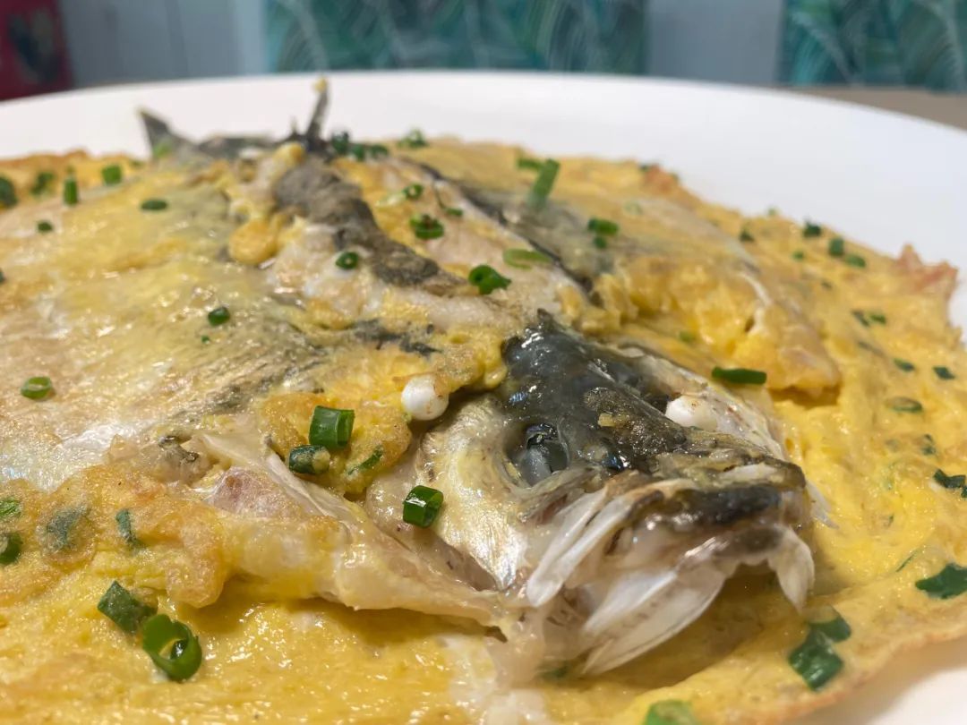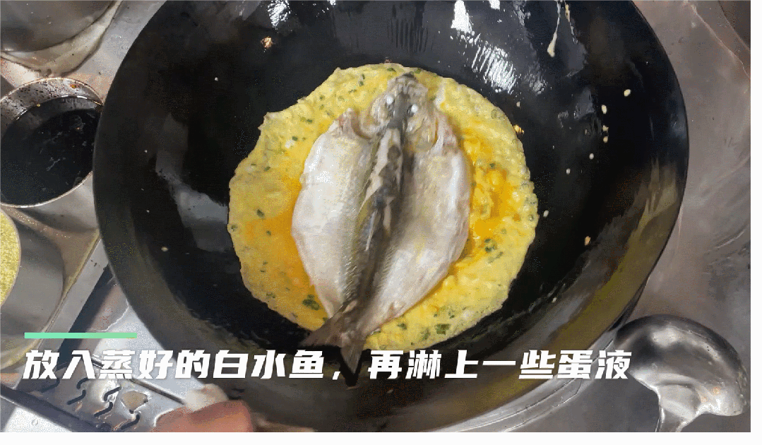 5.放入蒸好的白水鱼,再淋一些蛋液,煎至两面金黄即可出锅。