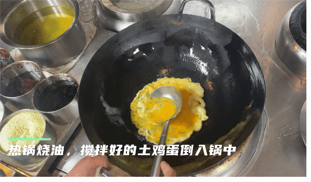4.热锅烧油,搅拌好的土鸡蛋倒入锅中塑型,晃动锅,避免粘锅。