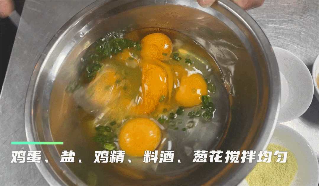 2.鸡蛋、盐、鸡精、料酒、葱花搅拌均匀。