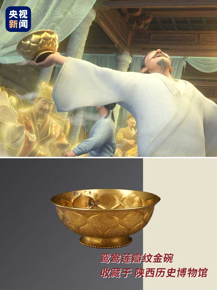 李白和友人碰杯的酒碗是鸳鸯莲瓣纹金碗