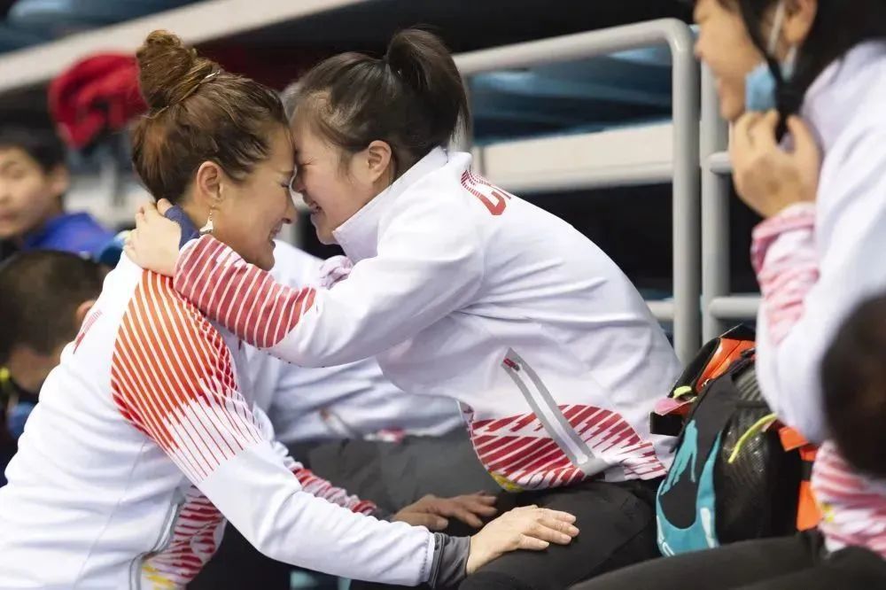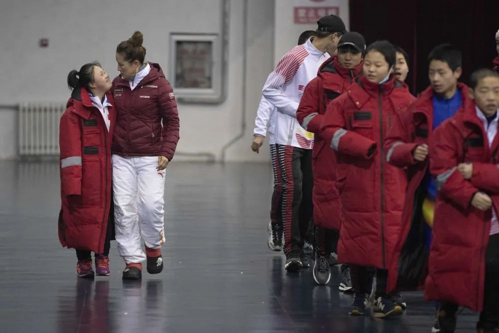 在七台河体育中心,张杰(左)在训练前和残障孩子交流(2022年1月11日摄)。新华社记者 谢剑飞 摄