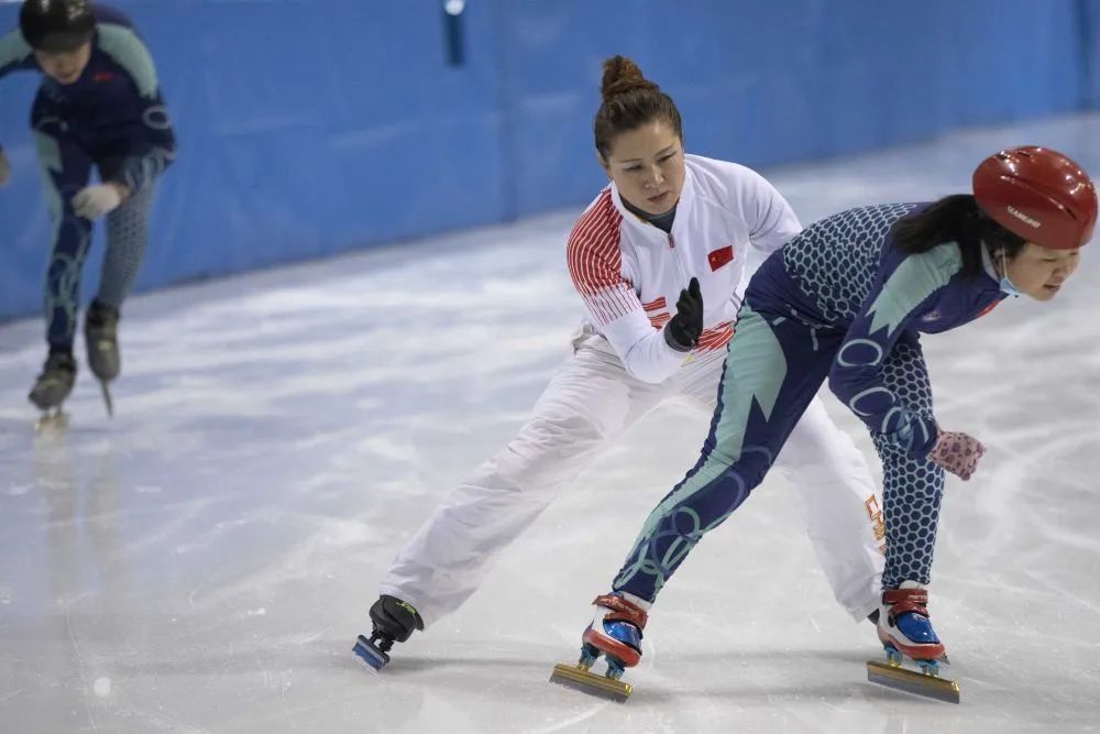 在黑龙江七台河体育中心,张杰(中)指导孩子们进行冰上训练(2022年1月11日摄)。新华社记者 张涛 摄