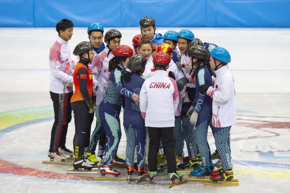 在七台河体育中心,训练结束后张杰(中)被孩子们围绕(2022年1月11日摄)。新华社记者 谢剑飞 摄