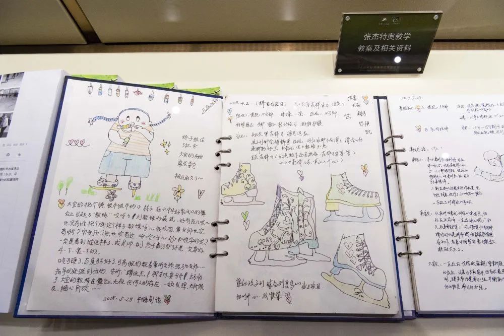 这是2022年1月8日在七台河短道速滑冠军馆“折翼天使的翅膀——张杰”展厅内拍摄的张杰教导残障孩子滑冰用的笔记和手绘训练图。新华社记者 谢剑飞 摄