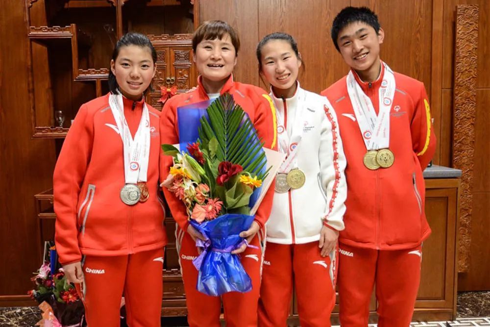 这是张杰(左二)和唐春雷(右一)、高萌(右二)、聂双月的合影(资料照片)。唐春雷、高萌和聂双月曾在2017年第11届世界冬季特奥会中获得4枚金牌、2枚银牌。新华社发