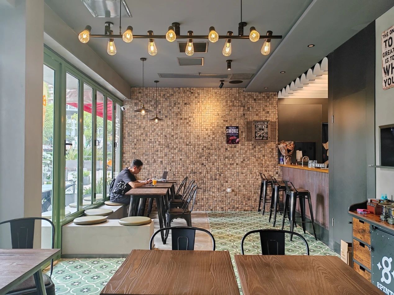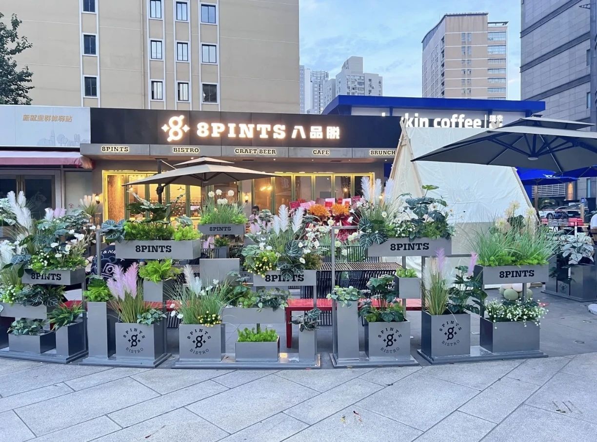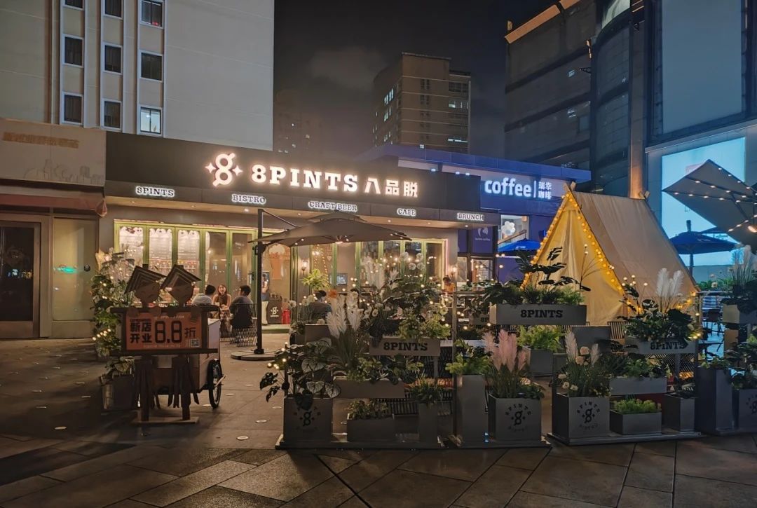 傍晚暖黄色的灯光下,八品脱显得格外温馨。茂盛的鲜花绿植和室内的木质装修相映成趣,室外的遮阳伞和帐篷更是增添了一丝户外野趣。