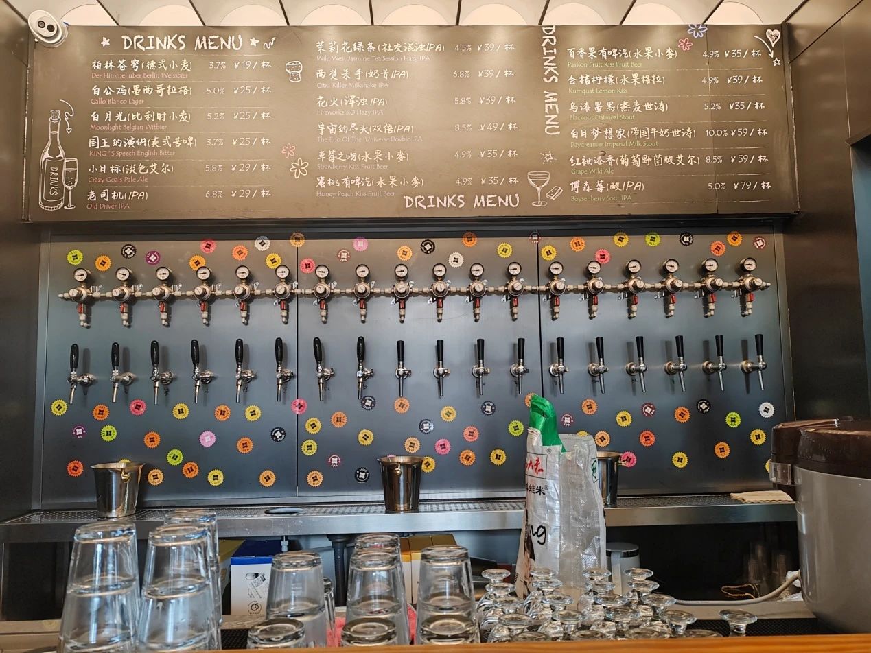 对于资深的酒迷,他们会推荐经典招牌“老司机(IPA)”或者“小目标(淡色艾尔)”,酒香醇正,余韵深厚;对于初次尝试精酿生啤的新顾客,则会建议从果味啤酒汽水开始。