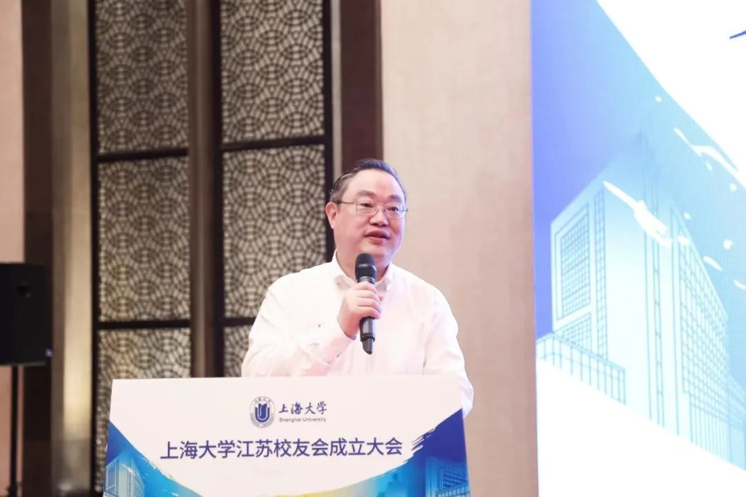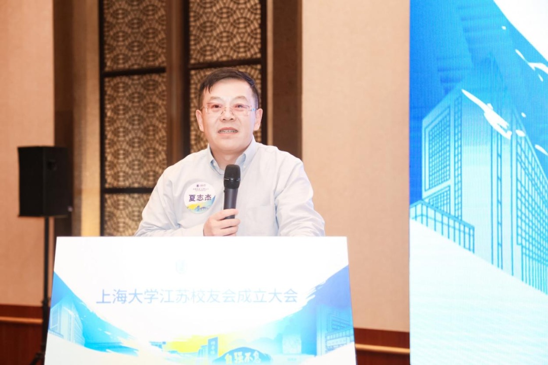 新当选的江苏校友会会长、1985届校友、俄罗斯工程院外籍院士夏志杰发言。他回顾了在上大的求学经历,感恩母校的培养和信任,表达了江苏校友会成立的喜悦之情,并对全体与会领导、校友及嘉宾表示衷心的感谢。他表示,将带领理事会成员认真履行职责,建立合作交流平台、人力资源共享平台、校友活动平台、与母校的联系平台,共同为社会发展贡献“上大”力量。