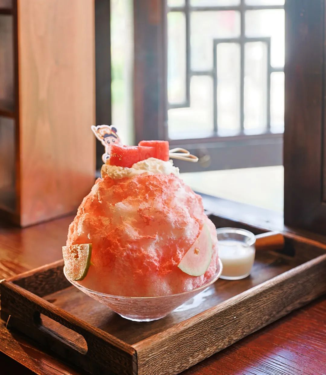 用8424西瓜制成的西瓜刨冰,借鉴南方水果撒梅粉提甜度的思路,在刨冰外铺了一层新鲜西瓜、红心芭乐切片,搭配超丰富里料:西瓜果肉、草莓味栗米条、珍珠豆……再淋上炼乳,错过它,夏天真的会后悔!
