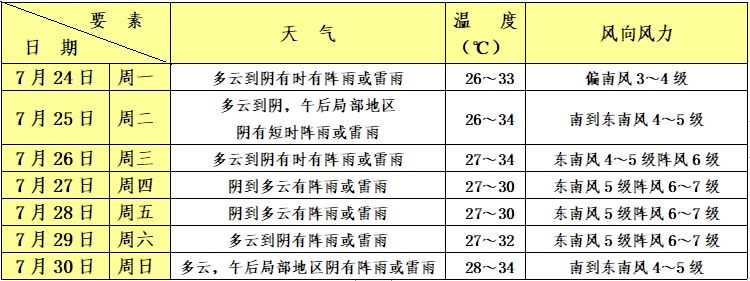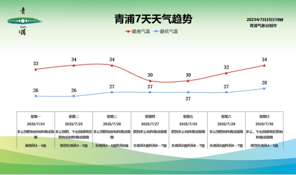 下周天气大部分时间阴天或多云为主,受今年第5号台风“杜苏芮”北上的外围影响,7月26日起青浦区多阵雨或雷雨天气,雨伞常备,建议大家持续关注气象部门发布的最新天气信息。