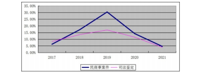 从图2可知,诉中司法鉴定案件数呈逐年增长趋势,与民商事案件走势正相关。在科技水平日益发展的社会,越来越多的案件需要通过司法鉴定来作为认定事实的依据。