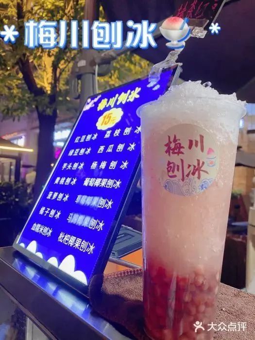 梅川路上一家不起眼的小店,在一个酒吧的门口~ 最老式通俗的吃法,一个塑料杯一个小勺,刨冰叠成小山丘,承载了一个夏日的回忆~招牌一下就可以看到的,都是一些经典款。绿豆、赤豆这些都是小时候爱吃的口味。刨冰是用机器打出来的,有渣渣感~冰融化得很快,不像小时候需要用勺子铲很久挖很久,不过吃口上倒是很爽口!地址:梅川路1508号
