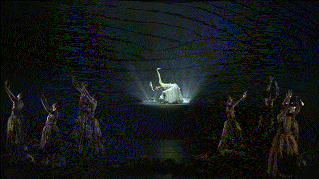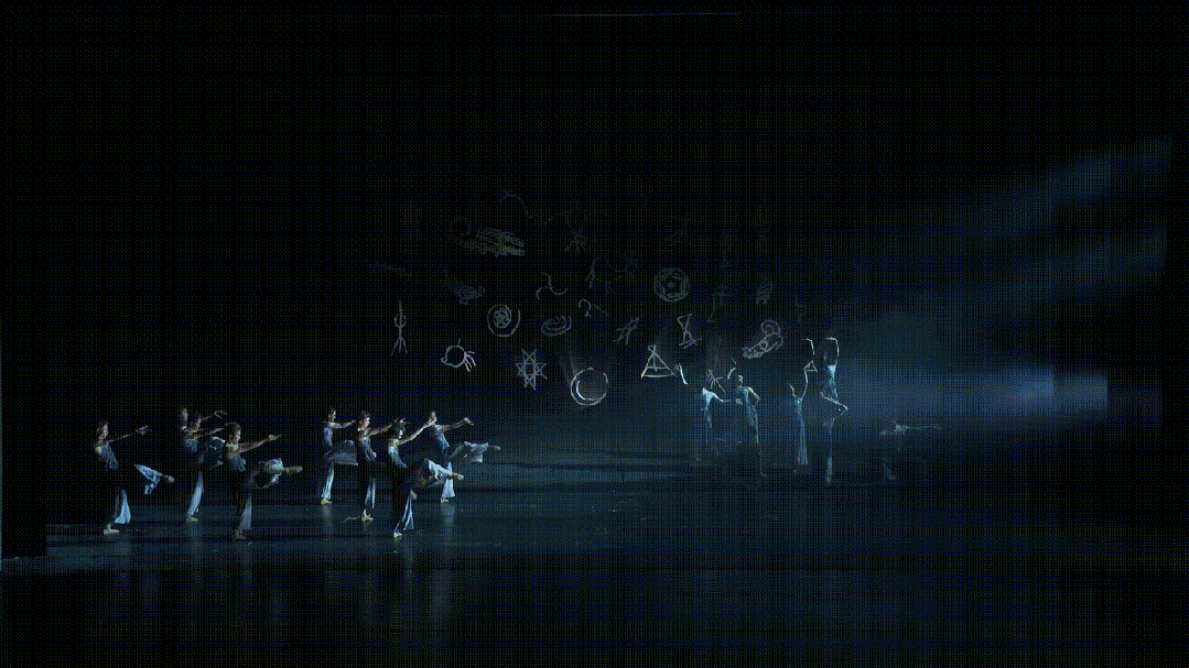“谷物”篇中,先民的稻作带领观众回溯中国农耕文化起源,重新审视我们赖以生存、不可或缺、更将影响深远未来的农业文明。玉琮,被古人视为沟通天地之间的媒介。“玉琮”一幕里,神徽图腾在舞台上被放大,玉鸟“翩翩起舞”,从刻画变成活生生的形象。