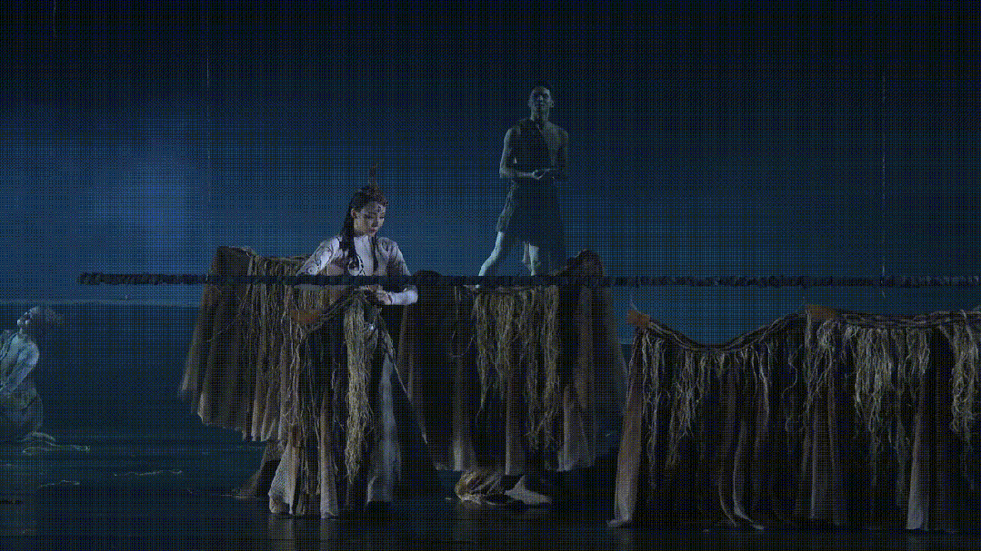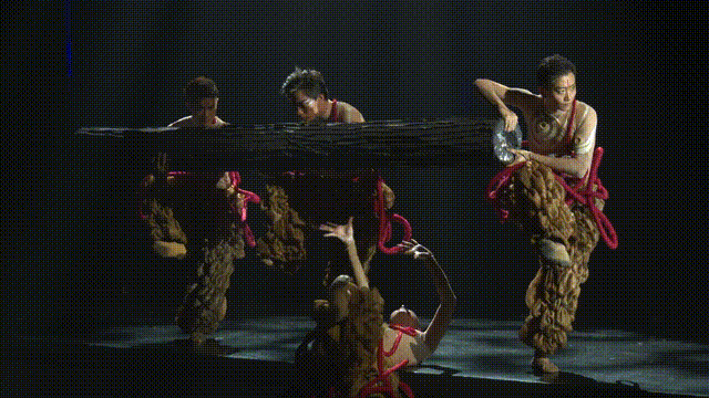 舞集中演员的服饰以麻织为主,舞台的空中装置也以麻织品上的经纬线结构为灵感,用疏密交替的线条来呼应塑造远古时期那质朴却又华丽、神秘而朦胧的氛围。