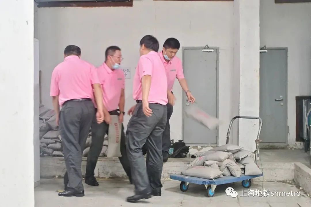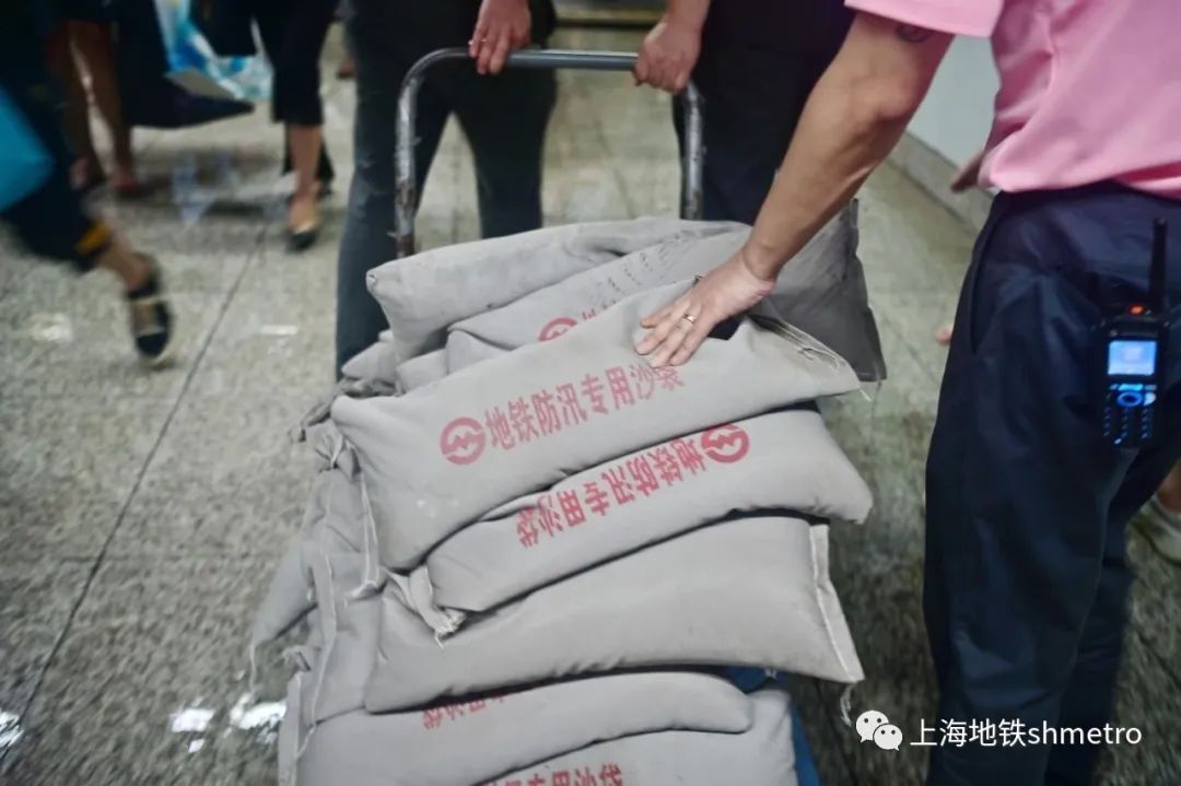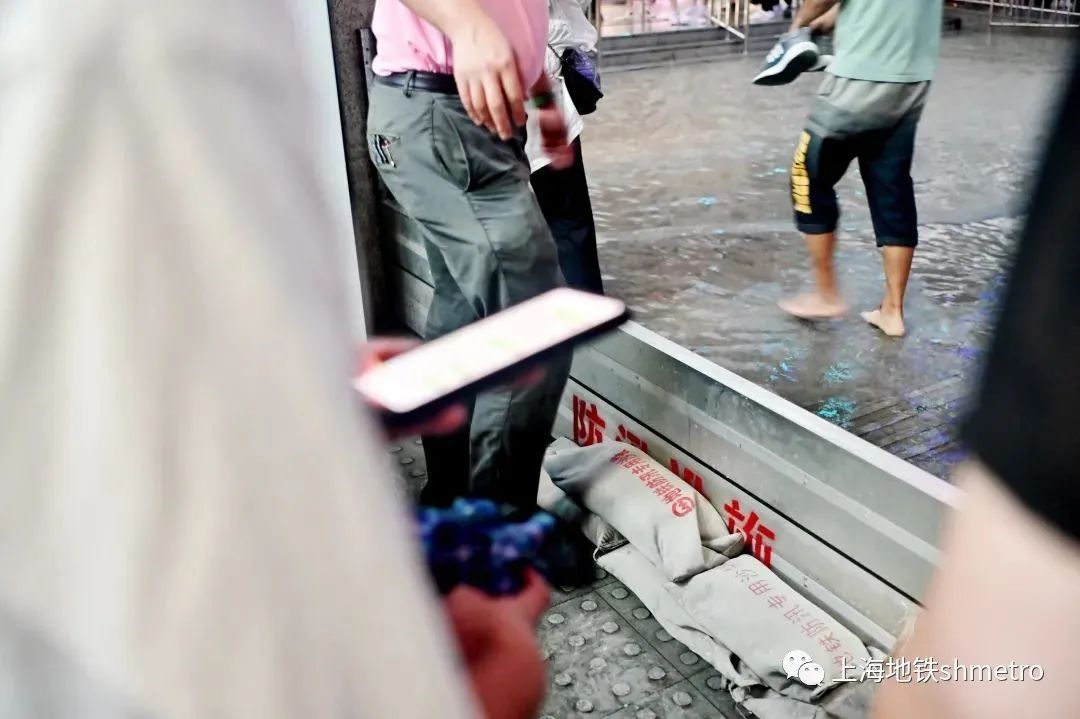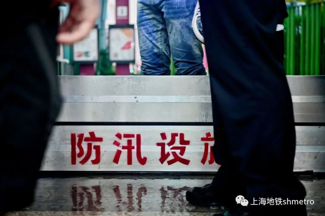 在发现站外道路及国家会展中心内部道路均出现积水情况后,突击队员迅速奔各出入口,架设防汛板、堆上沙袋,形成双重防护,并拿起排水板,将平台上的积水往站外排放,避免雨水倒灌至车站的情况。