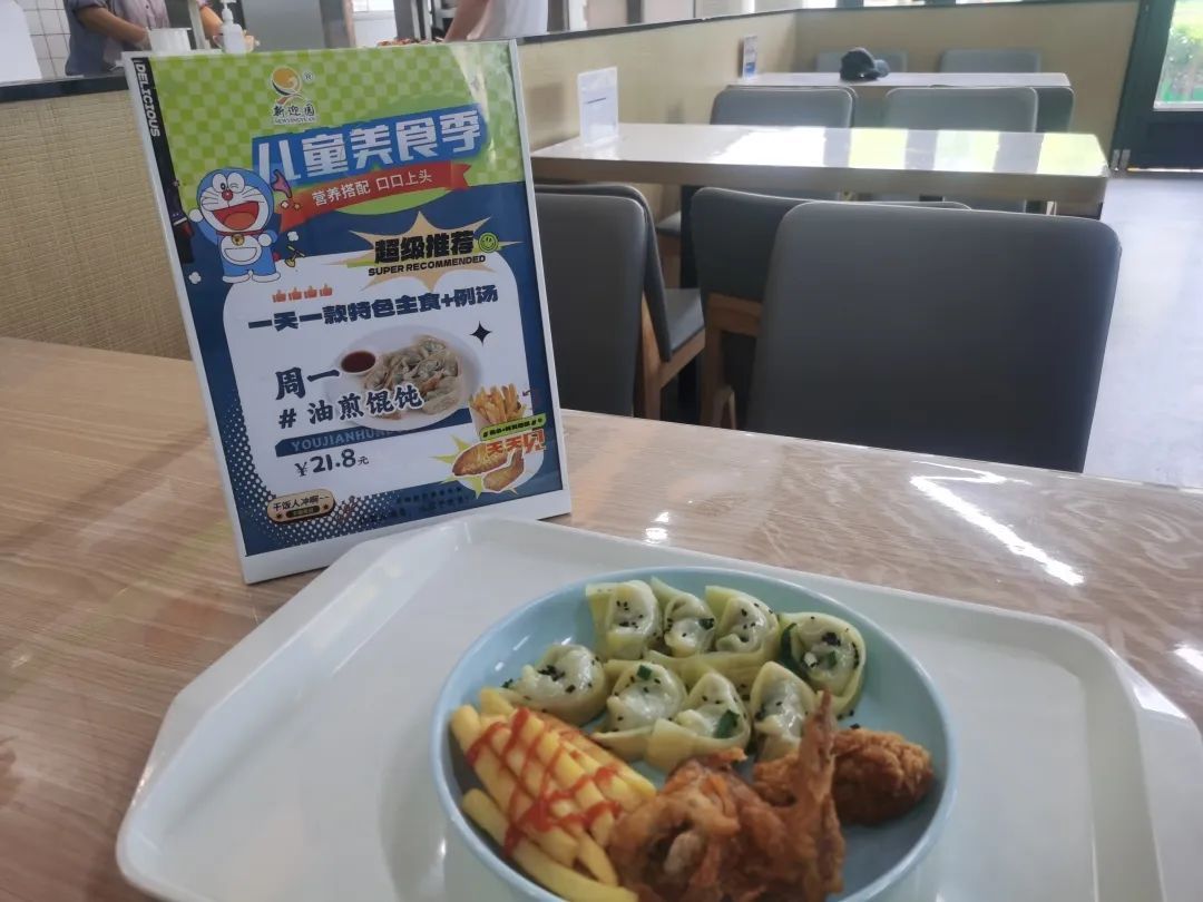 记者注意到,当前正值暑假,餐厅不仅推出了绿豆汤等防暑降温饮品,还推出了儿童套餐,包括薯条、炸鸡、蛋炒饭、意大利面等,周一至周五每天不重样,价格为21.8元一份。“我觉得这里的菜品物美价廉,花样很多,也很好吃。”住在附近的四年级学生沈书闻第二次来“我嘉餐厅”吃饭,他点了一份儿童套餐,有煎馄饨、薯条和鸡翅。何佩罡表示,儿童套餐都是现场加工的,方便家长上班、老年人带孩子的时候快速享用。