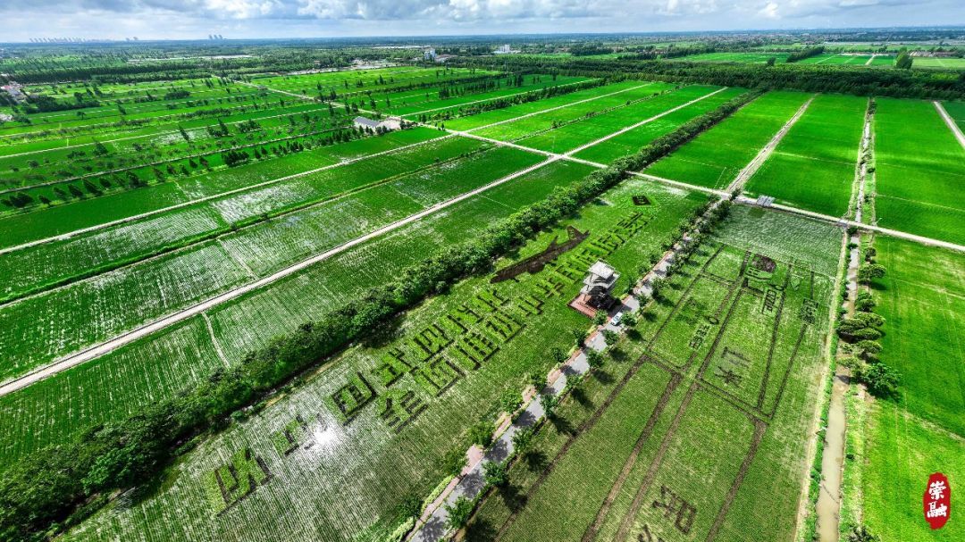 在西侧稻田里,正大300万羽蛋鸡项目、冠华公司、北滩麋鹿苑、稻米文化中心等图案在稻田间分外醒目,代表新村乡将继续打造“一袋米”“一口锅”“一枚蛋”“一头鹿”产业布局,朝着生态产业化、产业生态化的协同发展之路不断迈进;也表达了新村乡在新征程上实现“稻香、业兴、村美、民乐”的美好愿景。