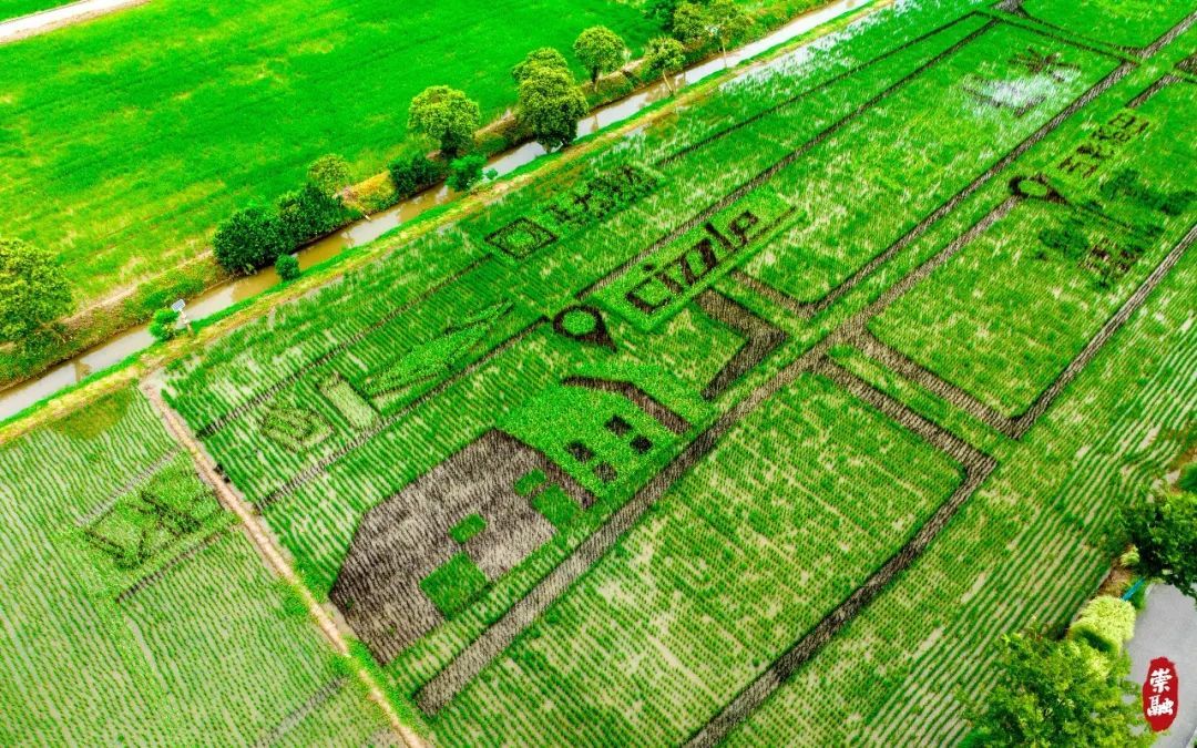 夏日清晨的阳光明亮热烈,青翠的水稻与村舍交相辉映。登上观景台俯瞰,2幅“五彩水稻画”在田野上徐徐展开,长100米、宽37米,用黄、白、紫、红、绿5种颜色的水稻栽培而成,共占地42亩。