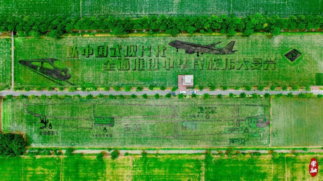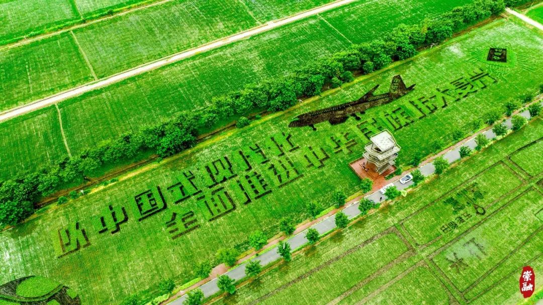东侧稻田里,绣着“以中国式现代化全面推进中华民族伟大复兴”等立体艺术大字,复兴号高铁、国产大飞机C919、中国芯等图案栩栩如生,寓意新村人民坚定信心跟党走、踔厉奋发新征程的火热激情,表达了对祖国的祝福与热爱。