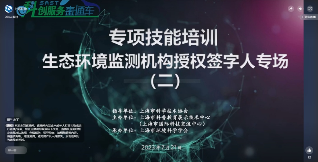 7月21日下午,由上海市科学技术协会指导,上海市科普教育展示技术中心(上海市国际科技交流中心)主办,上海市环境科学学会承办的“上海市科协科创服务直通车”专项技能培训生态环境监测机构授权签字人专场(二)成功举办。通过“上海科协”视频号和微博的同步直播,为线上近3500人次参会人员带来生态环境监测领域授权签字人基础知识培训。