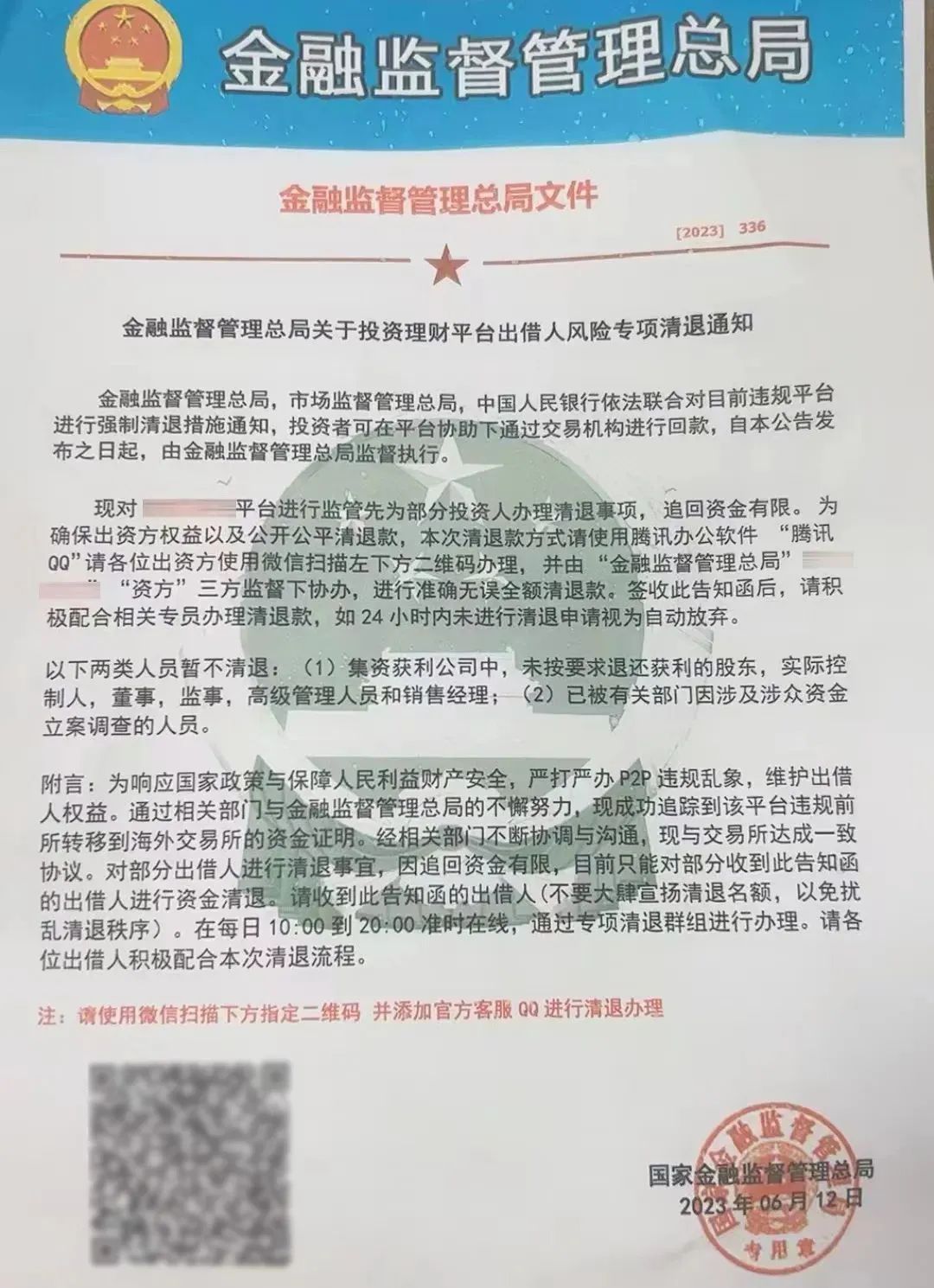 近日,江苏张家港的李女士收到了“国家金融监督管理总局”寄来的一份“红头文件”,表示现在为某平台的部分投资人办理清退事宜。
