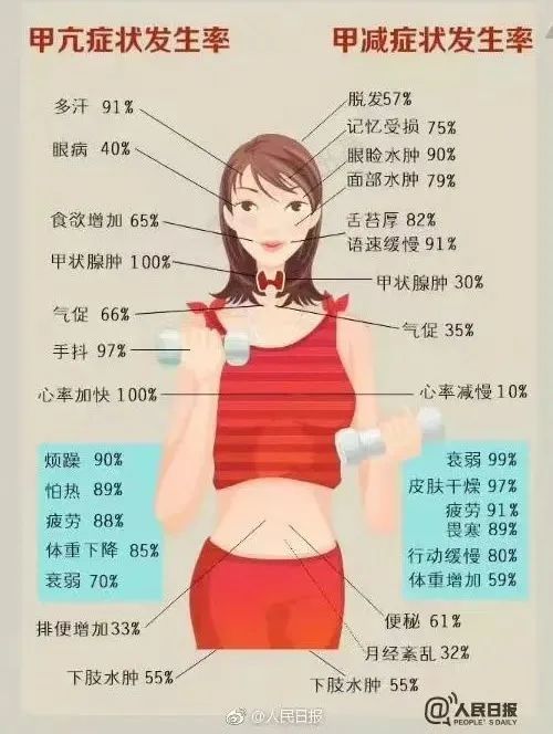 当甲状腺功能异常时,就会发生甲状腺功能亢进症(俗称“甲亢”)或者甲状腺功能减退症(俗称“甲减”),出现时应进行专科治疗。