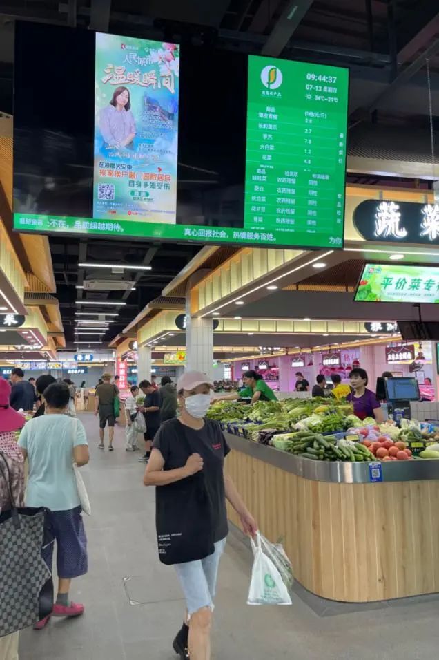 市场配备中央空调、服务台、公平秤、公示大屏等完善的设备设施,提升了居民们的购物体验。